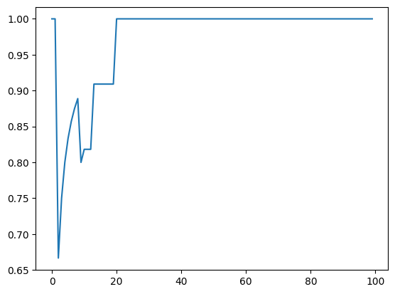 test_ECM = Priming_ECM(num_actions =2, action_primes = [0., 1.5])#Number of steps to run simulationT =100data_log = [None] * Tenv = RLGL() #create a default red-light-green-light environmentfor t inrange(T): observation = env.get_observation() action = test_ECM.sample(observation) reward = env.get_reward(action) test_ECM.learn(reward) data_log[t] = {"env_state": env.state, "action": action, "reward": reward} env.transition(action)plt.plot(range(T), [np.mean([data_log[step]["reward"] for step inrange(i-10,i+1) if step >=0]) for i inrange(T)]) #plot a 10 step moving average of the reward