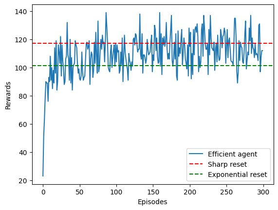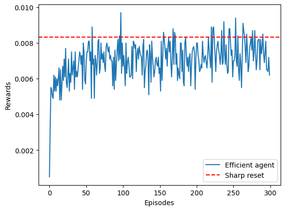 We can see that with only few episodes, the agent is already able to go from a very bad initial strategy to something that outperforms the exponential strategy and closely matches the efficiency of the sharp resetting!