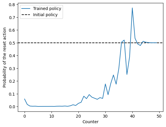 plt.ylabel('Probability of the reset action')Text(0, 0.5, 'Probability of the reset action')