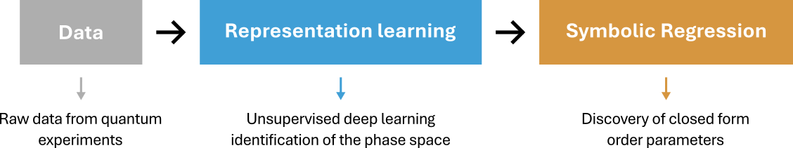 The pipeline is composed of two main components: first, a variational autoencoder (VAE) learns representations that compress the input into the minimal set of physical parameters needed to understand the data. Second, and based on the learned representations, a symbolic regression (SR) module finds closed form equations able to distinguish the different identified regimes.