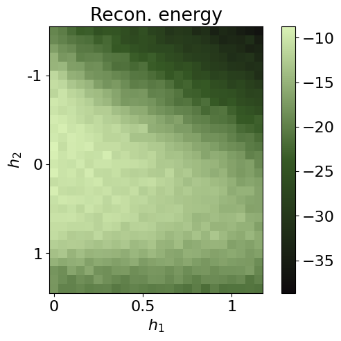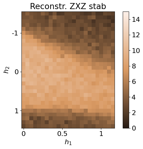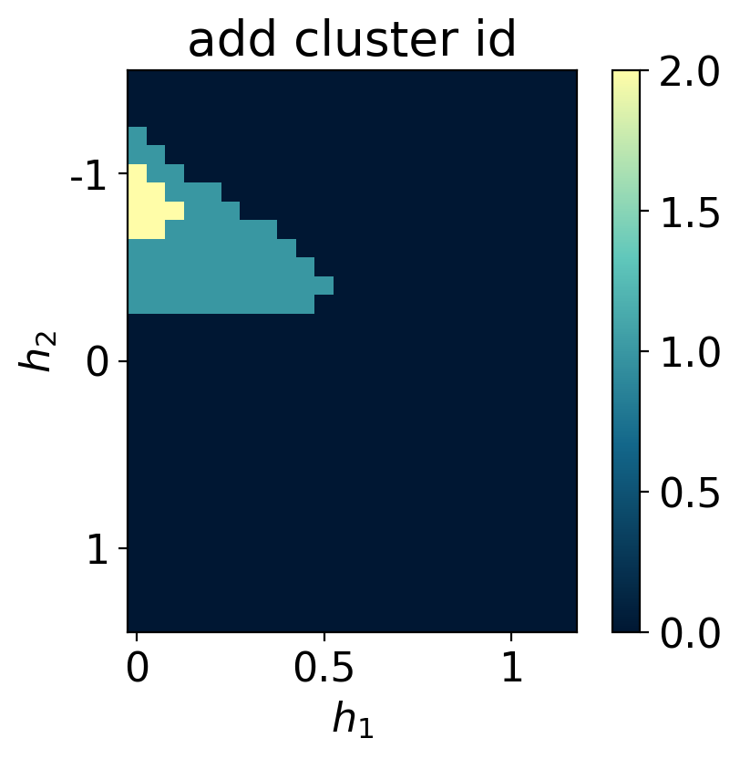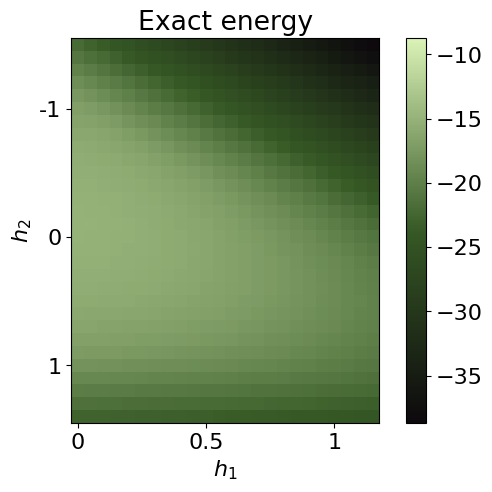 where \(\sigma^x_i,\sigma^y_i,\sigma^z_i\) are Pauli operators acting on site \(i\). We consider open boundary conditions defined by \(\sigma^z_0 = \sigma^z_{N+1} = \mathbb{1}\). We sweep the transverse-like field \(h_1\in[0.05,\,1.20]\) and the Ising coupling \(h_2\in[-1.5,\,1.5]\) to probe the competition between the cluster term, the transverse-field (paramagnetic) term, and nearest-neighbor Ising correlations.