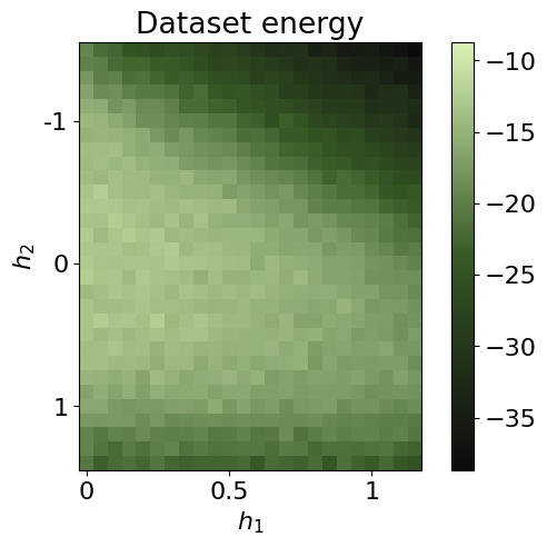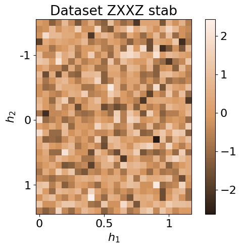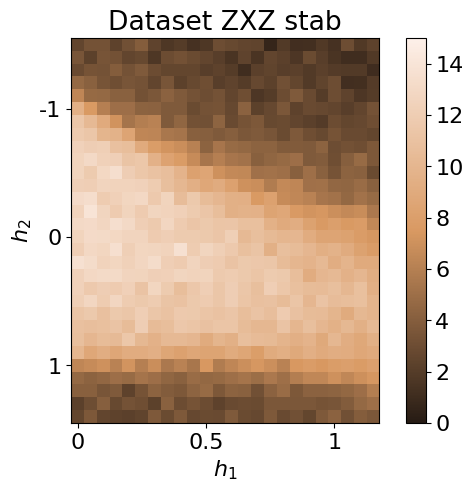 The dataset is produced by first computing the exact ground state wavefunction using Netket, similar to the J1J2 model (see tutorial). Then, classical shadows are generated by randomly sampling the Paulis and their respective outcomes using the probabilities given by the wavefunction. This is done using the get_classical_shadow() function from QDisc.dataset.