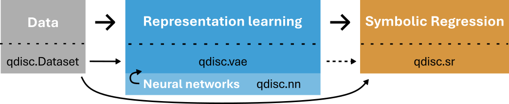 The qdisc.vae module uses the qdisc.Dataset and neural networks from qdisc.nn to learn a representation. Then the qdisc.sr module uses the dataset (and, for some approaches, the VAE) to extract analytical expressions.